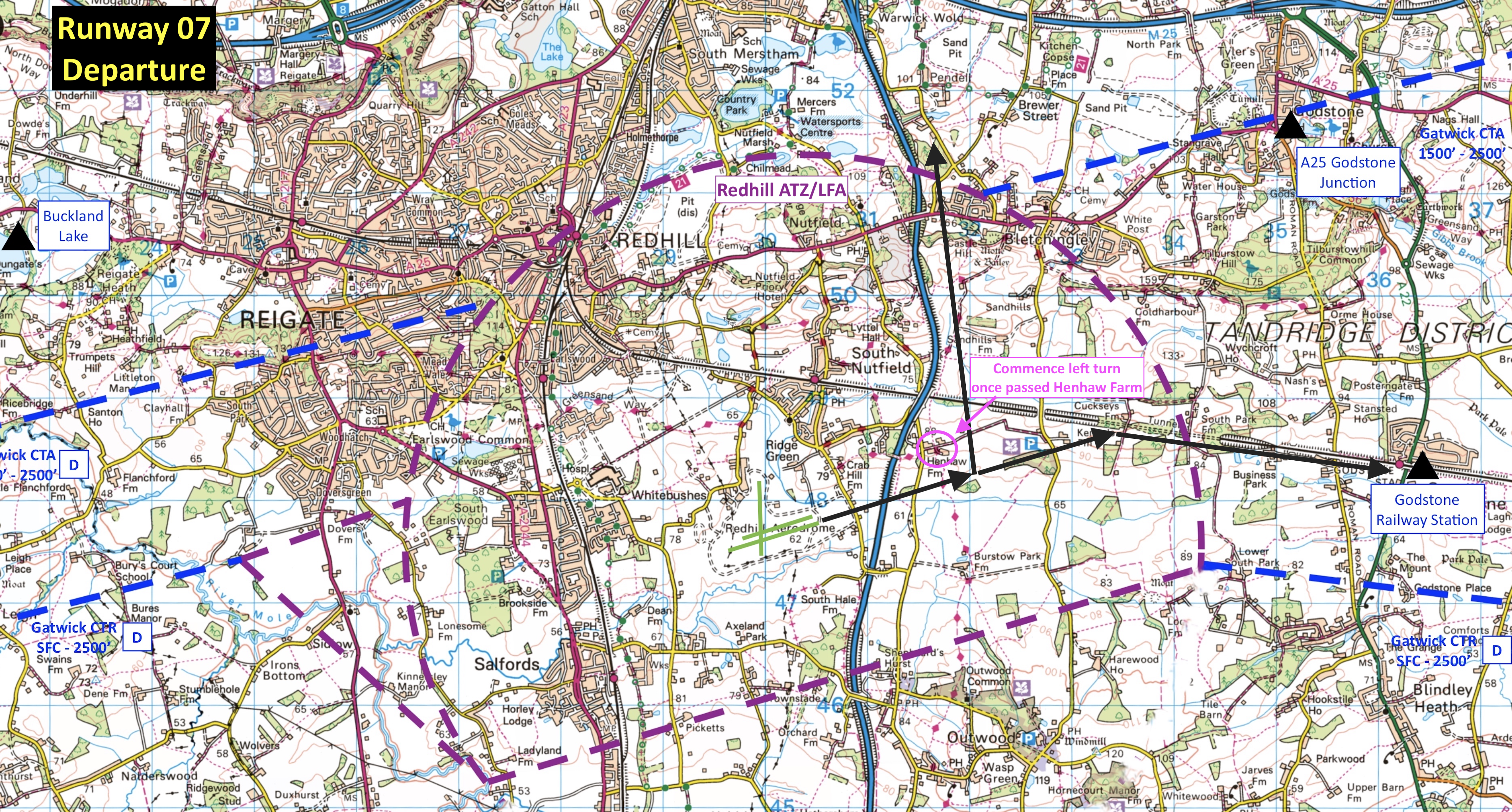 - Fixed-wing aircraft departing from Runway 07L/R must climb straight ahead, tracking the extended centre-line, until passed Henhaw Farm before turning on track. A diagram of the departure route is available here.
